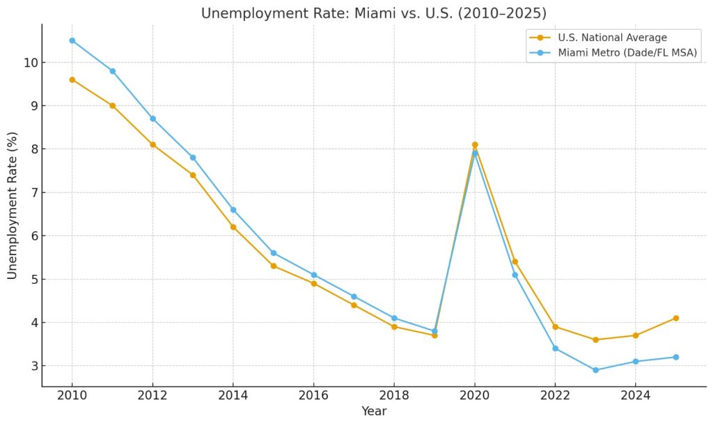 Over the past two decades, Miami-Dade County and the greater Miami–Fort Lauderdale–West Palm Beach metropolitan area have consistently reported unemployment rates in the 2.5–4.0% range in good times. In July 2025, Miami-Dade was reported at 2.8%, while the metro rate hovered around 3.2–3.4%. By comparison, the Florida statewide rate stood at roughly 3.8%, and the U.S. national average in 2024–2025 was near 4%. On paper, Miami looks like a labor market success story.
